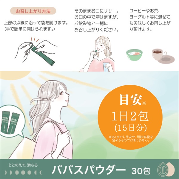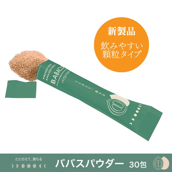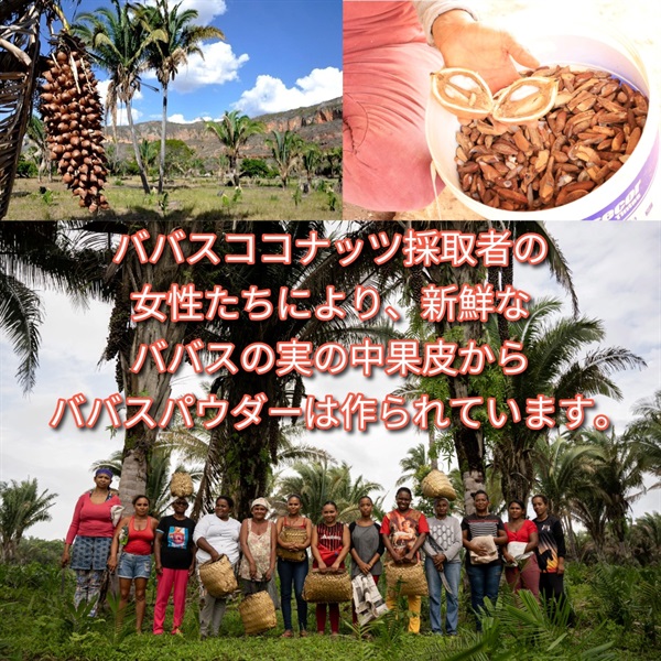 ※ババスパウダーは、ブラジル・マラニョン州で新鮮な内に採取されたババスの果実から中果皮を取り出し、電気オーブンで水分を取り除き乾燥させ、粉砕機で細かいパウダーとなり袋詰めされ日本に送られます。日本国内の食品工場でブドウ飴(トウモロコシ由来・遺伝子組み換え原料なし)を混合し、飲みやすいババスパウダーとなります。