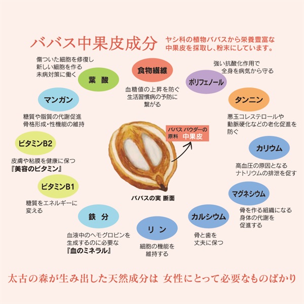 ババスパウダーは、ババス果実の中果皮を乾燥させ粉末加工を施した、